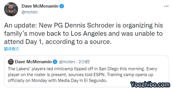 詹姆斯组织的湖人迷你训练营正式开营,湖人众将几乎全都前往圣迭戈参加,据espn湖人跟队记者Dave McMenamin报道,湖人全队只有施罗德缺席迷你训练营的第一天,因为施罗德与他的家人们正在准备搬家到洛杉矶,安顿好家人后,施罗德将与球队汇合。