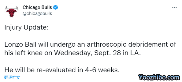 来源:jrs直播网09-22 10:22jrs直播网09月22日,芝加哥公牛官方宣布,球队后卫朗佐-鲍尔将于北京时间9月29日在洛杉矶接受左膝关节镜清创手术,将在4-6周内重新接受评估,这意味着鲍尔至少再伤停4-6周,将缺席新赛季训练营和季前赛,暂无复出时间表。