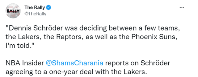 来源:jrs直播网09-17 15:05jrs直播网09月17日,名记Shams报道称,施罗德计划和湖人签下1年264万美元的合同,再次为这支球队效力,为此他拒绝了猛龙、太阳等队的邀请。施罗德本人也第一时间更新社媒,重回湖人后首次发声。名嘴Bill Simmons依然看衰湖人前景,认为得到施罗德湖人也只是西部9号种子。
