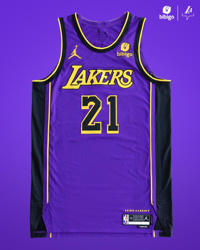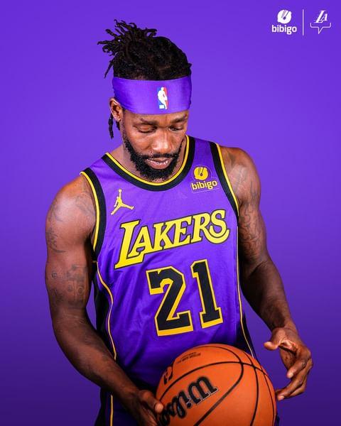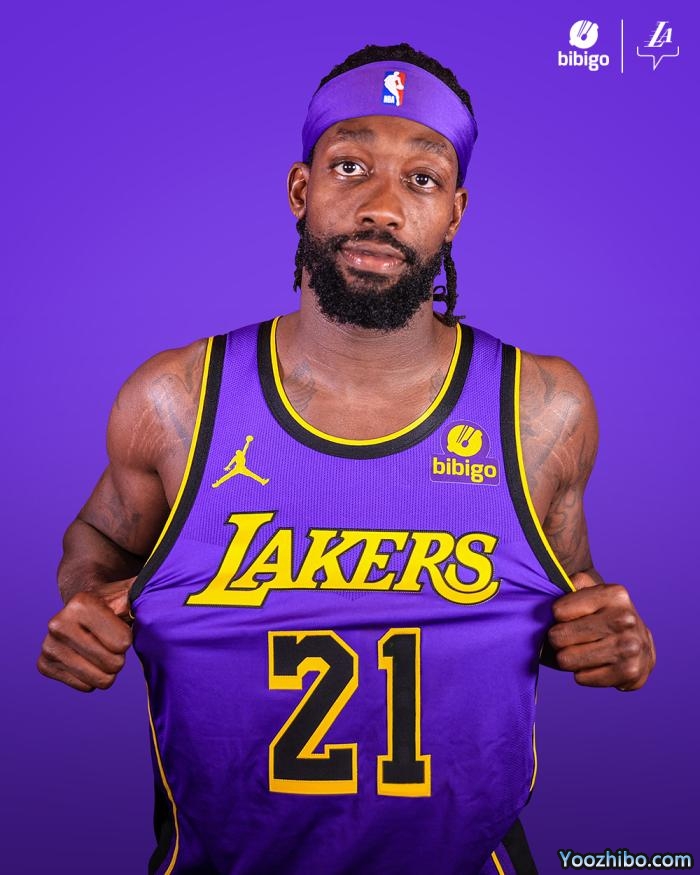 贝弗利戴着一款紫色加宽头带,身穿湖人主题版21号球衣,为湖人展示新款球衣。