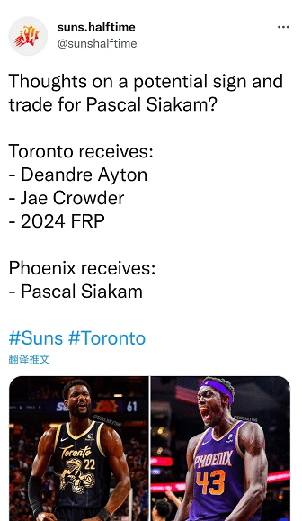 具体的交易方案为太阳队3换1交易得到西亚,送出艾顿+克劳德+2024年首轮签。毫无疑问,这是极具诱惑力的报价,艾顿是准全明星,克劳德也已经证明自己,而且,太阳队还倒贴选秀权,如果猛龙队决定推倒重建,接受这样一份提案,是明智的选择。