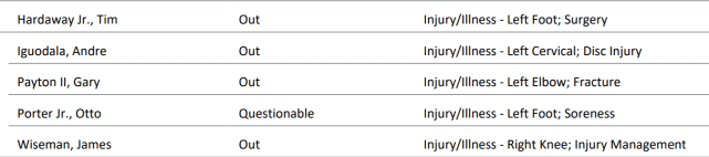 NBA官方也公布了西决G4的伤情报告。独行侠一方还是老样子,小蒂姆-哈达威左脚手术,继续缺阵;勇士一方除了小佩顿(左肘骨折)、伊戈达拉(颈椎伤病)和怀斯曼(右膝伤病)缺阵之外,G3受伤的波特被列为questionable(出战成疑,50%上场可能)。科尔透露波特很可能缺席G4,而名记查拉尼亚报道称,伊戈达拉的目标是在总决赛复出。