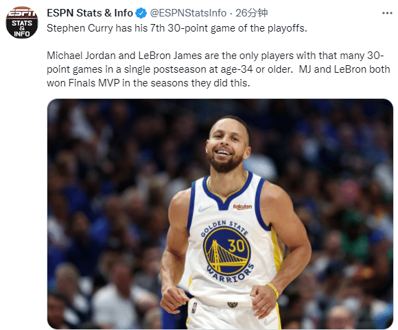 3、库里本赛季季后赛第7次单场30+,比肩詹姆斯和乔丹成为历史上第3位至少34岁多次30+的球员,在这样的赛季,乔丹和詹姆斯都夺得总决赛MVP。