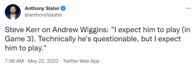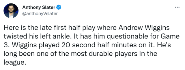 画面显示,当时独行侠还领先18分,维金斯突破东契奇上篮,在空中和克勒贝尔对抗后落地,左脚明显扭到。维金斯也是一瘸一拐地走了几步,Slater表示,维金斯在下半场又打了20分钟,感慨他是联盟里的铁人之一。主帅科尔表态:“我预计他能打(G3)。”