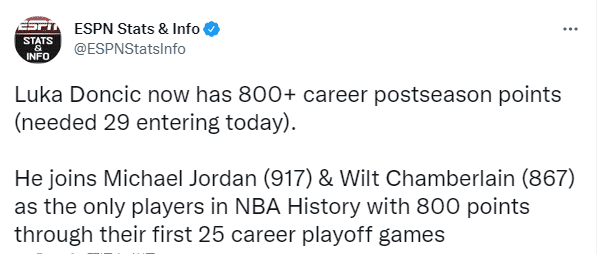 东契奇空砍遭遇里程悲——与布伦森半场同砍20+成NBA近25个赛季第二对队友;季后赛得分突破800分大关,比肩乔丹和张伯伦成为历史第3位前25场至少800分的球员;季后赛第7次40+,追平威少并列现役第5。