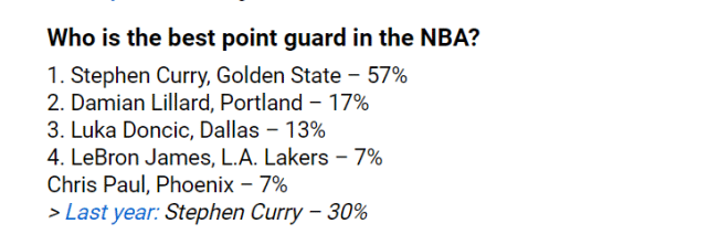 在最佳控卫的票选中,库里得到了57%的票数,而上赛季的同一票选中,他的得票率是30%,同样位居第一。或许是上赛季的出色表现,让他征服了更多的总经理。排名第二的是利拉德(17%),第三是东契奇(13%)。詹姆斯和保罗各得到7%的票数。