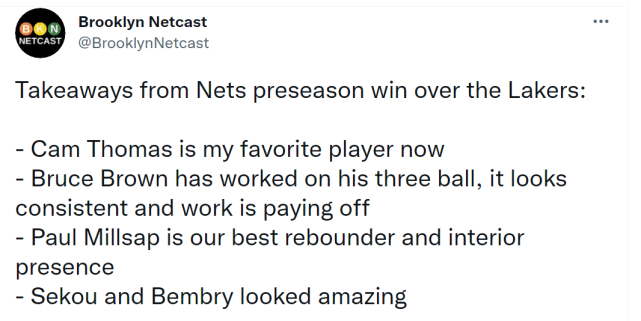 来源:jrs直播网10-04 11:07jrs直播网10月04日讯 ,篮网123-97大胜湖人,取得了季前赛的首场胜利。双方均有多名核心缺阵,对于篮网而言,这场大胜没有什么实质意义,但美媒Brooklyn Netcast指出球队还是有四大收获。