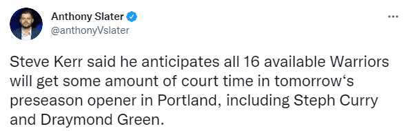来源:jrs直播网10-04 10:55jrs直播网10月04日讯 ,NBA季前赛已经正式打响,勇士众将都能上场参加比赛,据勇士记者Anthony Slater报道,科尔表示,预计所有16名可用的勇士球员都将在明天对阵波特兰开拓者的季前赛揭幕战中获得一定的上场时间,包括斯蒂芬-库里和德雷蒙德-格林。
