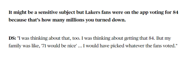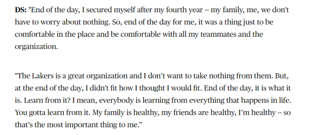 1年590万签约绿军后,施罗德经常被调侃损失大笔金钱。采访中谈到这个话题,施罗德回应道:“其实,在我打完生涯第四个赛季时,我的财务已经基本自由了,家庭和我都不用为任何(金钱方面的)事情发愁了。归根结底,我就是要找到一个让我感觉舒适的地方,让我感觉舒适的队友和球队。湖人当然是一支伟大的球队,我其实不想离开,但最终我们不太合适。事情该怎样就是怎样,对我来说,最重要的是家人朋友和自己都很健康。”