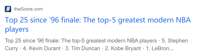来源:jrs直播网10-02 10:26jrs直播网10月02日讯 过去25年,NBA出现过不少巨星级的人物。近日,美媒theScore评选了近25年的25大巨星,并在10月2日公布了最终前五的排名。詹姆斯高居榜首,科比排名第二,位居第三至五位的依次是邓肯、杜兰特和库里。(注:这是theScore基于NBA50大巨星的延伸,所以没有乔丹、奥尼尔等已经在那份榜单上的球星。)