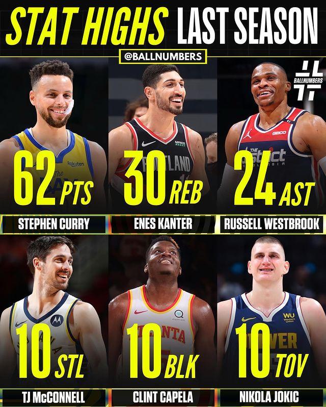 62+30+24+10!上赛季六大单场纪录:库里威少封王约基奇扎心