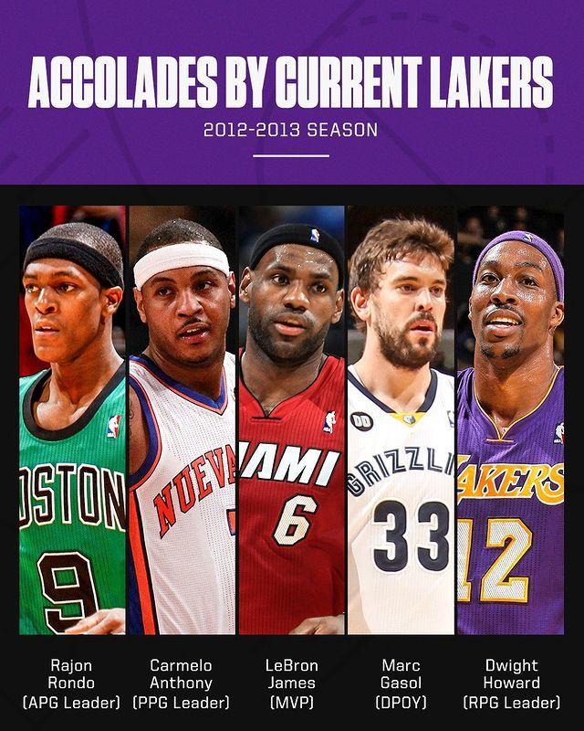 数据显示,2012-13赛季,朗多场均能送出11.1次助攻,安东尼场均能得到28.7分,霍华德场均能抢下12.4个篮板。小加索尔和詹姆斯拿到了两项大奖。就像ESPN说的那样,这证明了湖人队拥有多少经验。单就经验来说,他们真的是独一档。