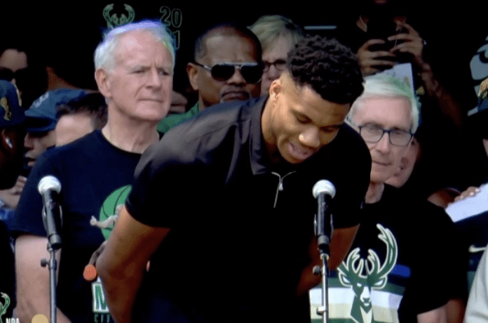 雄鹿队夺冠游行正式进行,报道称有50万人参与在庆祝舞台上,雄鹿球员们从替补开始,先后向球迷致辞。在霍勒迪、大洛佩兹和米德尔顿先后发表演讲后,字母哥压轴出场,朝着球迷大喊:密尔沃基,我们做到了!而雄鹿球迷则是大喊他们在季后赛中的口号:雄鹿六场夺冠!随后字母哥又一次挥拳怒吼,发泄自己内心的激动和喜悦。