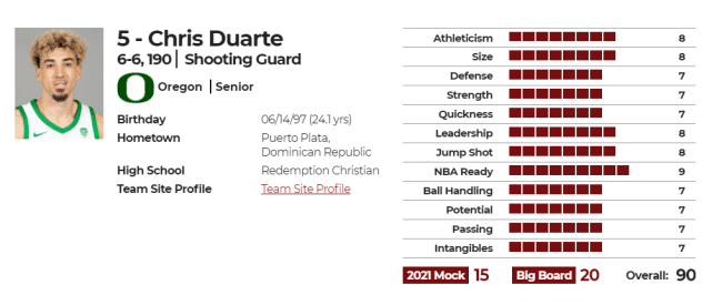 来源:jrs直播网07-23 11:49jrs直播网讯 北京时间7月23日,距离2021年选秀大会还有一周时间,湖人拥有首轮22号签。据The Athletic记者Sam Vecenie报道,多支球队相信湖人已经向一位新秀做出承诺:如果他跌到这个位置,湖人就将选择他!这位新秀就是俄勒冈大学的后卫克里斯-杜阿尔特。