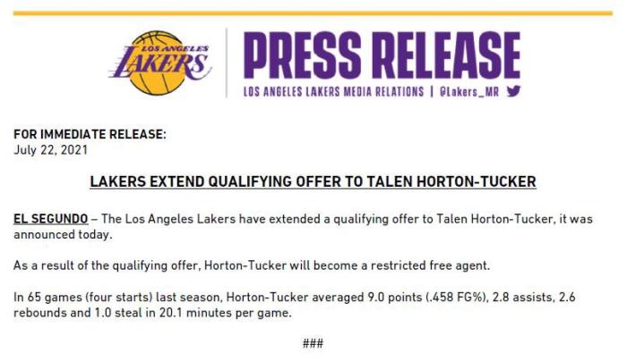 来源:jrs直播网07-23 11:33jrs直播网讯 北京时间7月23日,据名记shams报道,湖人已经给霍顿-塔克提供了资质报价,从而让塔克成为一名受限制的自由球;之后湖人正式官宣这一决定,有权匹配任何报价,可签2年1900万。