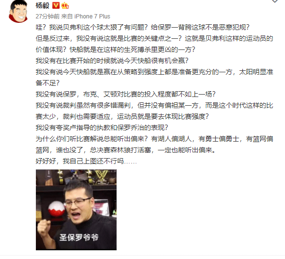 所以在赛后,很多球迷表示杨毅的解说是“双标”,太过于偏向太阳和保罗,而给予了快船看衰。很快杨毅就在社交媒体上进行解释,连发“5个没有”辩解,还配图一张自己大喊“圣保罗爷爷”用于自黑,称: