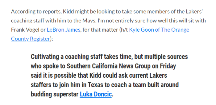 据名记Kyle Goon报道,由于培养一个新的教练组需要时间,基德有可能会邀请湖人现有的教练组成员,和他一起去德克萨斯州执教围绕东契奇而建队的独行侠。