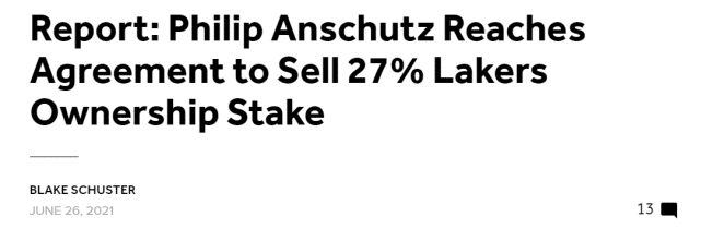 美媒报道称,安舒茨目前的身价是158亿美元,除了拥有湖人的股份,他还拥有NHL的洛杉矶国王队以及MLS的洛杉矶银河队的部分股权。