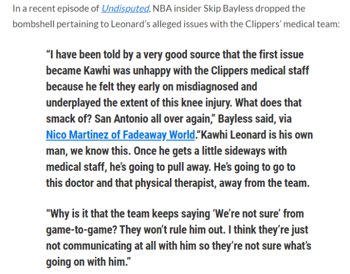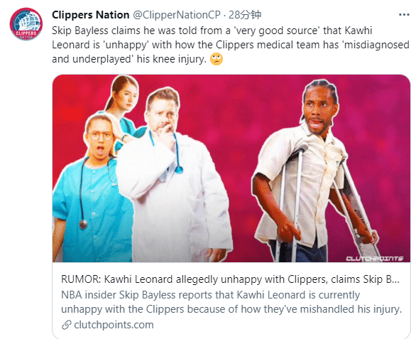 斯基普-贝勒斯表示:消息源告诉我,小卡对快船队医很不满,因为他觉得他们很早就误诊了他的伤势,低估了膝盖受伤的程度。这意味着什么?圣安东尼奥事件又来了;我们知道一旦小卡和队医有点不对劲,他就会离开。他要去离队去看医生和理疗师。