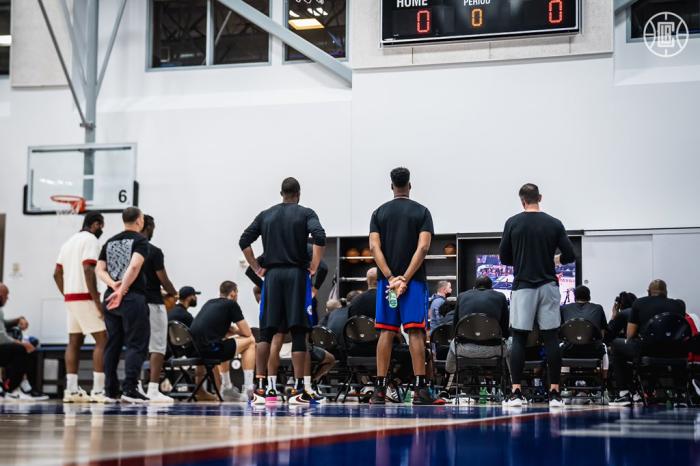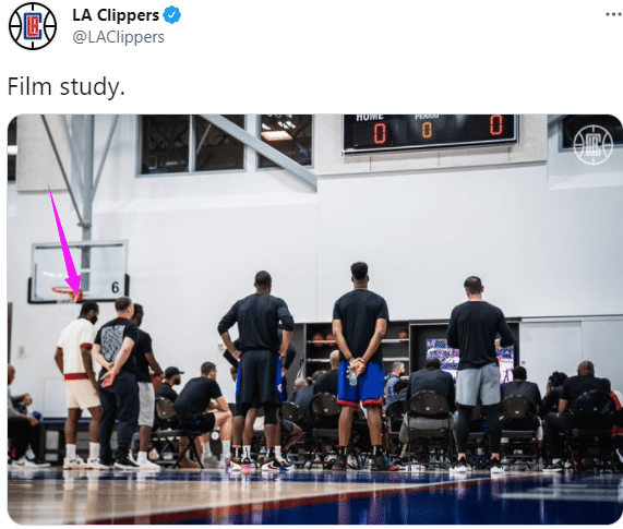 快船众球员都是坐在椅子上观看比赛录像,小卡身穿一套白色短裤、短袖和黑色口罩,和泰伦卢一起站在最后一排观看;此前快船已经宣布小卡因伤缺席第四场,快船在0-2落后的情况下赢下G3,小卡坐在包厢看比赛引争议。