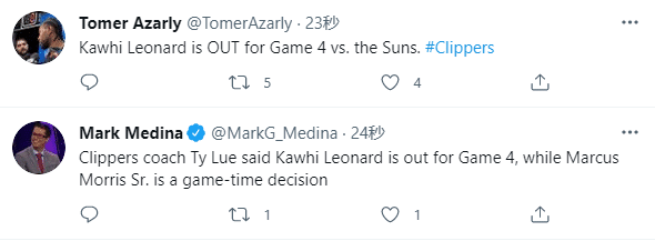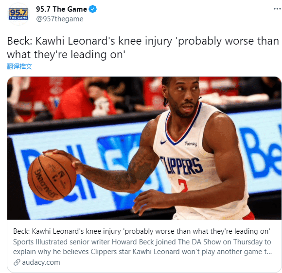 《体育画报》记者Howard Beck认为小卡已经打完了本赛季最后一场比赛,名记表示:如果小卡只是消肿,我们早就知道他的核磁检查结果了,但事实是快船没有更新任何消息,这暗示小卡的伤势比预期更糟糕;扭伤意味着撕裂,问题是小卡的十字韧带撕裂有多严重,到现在都没有他的任何消息,所以我觉得他的情况比快船所说的更糟糕,他不会回来了。