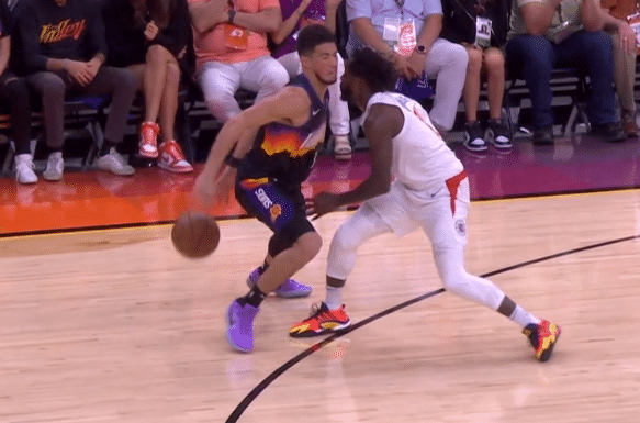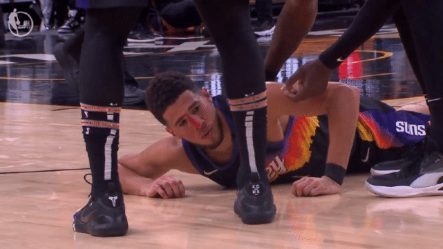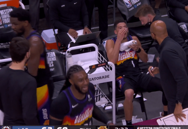 彼时比赛进行到第三节末段,太阳一度将分差拉开到9分,士气正盛却遭遇意外。布克持球单打贝弗利,后者贴防之下两人的面部发生了碰撞。