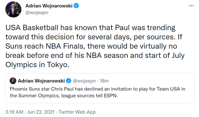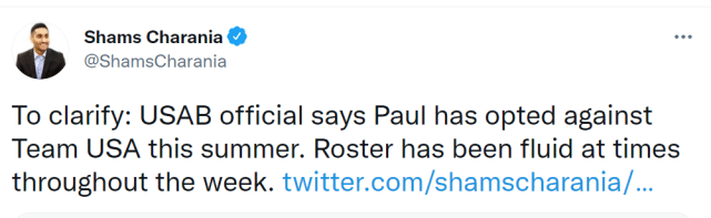 在沃纳罗斯基报道保罗拒绝邀请前,另一位名记查拉尼亚曾报道保罗已经决定出战奥运,但很快,他删除了之前的报道,并证实美国男篮的官员已经表示,保罗将不会参加今年夏天的美国男篮。保罗曾经在2008年奥运和2012年奥运两次夺冠。