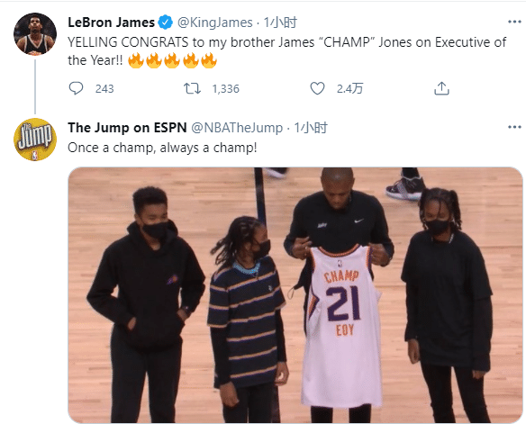 得知詹姆斯-琼斯获奖后,勒布朗-詹姆斯第一时间恭喜前队友,发推写道:祝贺我的兄弟当选年度最佳总经理。两人曾在热火和骑士当过队友,两人关系很好。