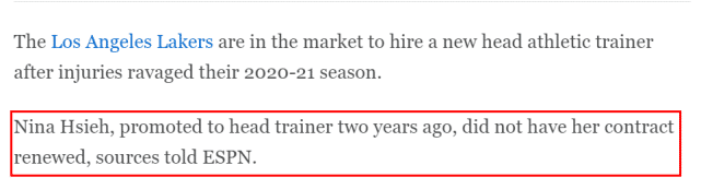 妮娜-谢已经为湖人工作十几年,她先负责湖人发展联盟球队的健康保健规划,随后在湖人担任训练师助理,2019年8月,她获得晋升,成为湖人的首席训练师。去年10月,湖人成功夺冠,妮娜-谢也成为了美国职业体育史上第一位冠军球队的女性首席训练师。