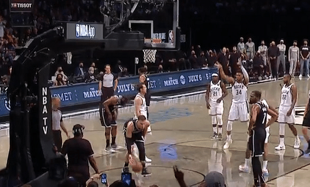同时字母哥的罚球也是焦点,首节他罚球的时候篮下的杜兰特和格里芬都看着屏幕,不去抢板,因为字母哥的罚球经常10秒超时。到了次节,字母哥的罚球被全场嘘声和倒计时,结果他罚球出手三不沾,很尴尬。