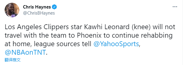 来源:jrs直播网06-20 10:26jrs直播网讯 北京时间6月20日,快船巨星莱昂纳德最新伤情出炉,据名记海耶斯报道,小卡因膝盖不会随队前往菲尼克斯,继续留在洛杉矶接受治疗,这意味着小卡继续伤停,因伤缺席西决G1。