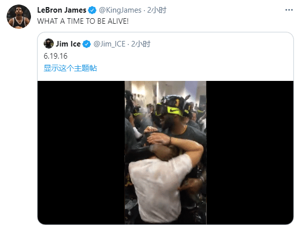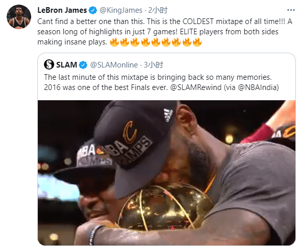 詹姆斯转发16年总决赛高光集锦,发推写道:找不到比这个更好的了,这是有史以来最酷的混剪!一个赛季的高光精华浓缩于7场比赛中,双方的精英球员完成了疯狂的对决。