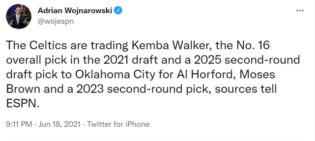 来源:jrs直播网06-19 12:02jrs直播网讯 北京时间6月18日,据ESPN名记沃纳罗斯基报道,凯尔特人和雷霆达成了一笔3换3的交易,凯尔特人送出肯巴-沃克、2021年的首轮16号签和2025年的次轮签,得到雷霆的艾尔-霍福德、摩西-布朗和2023年的次轮签。