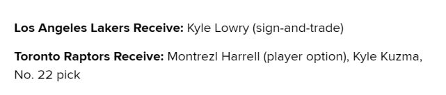 根据美媒推荐的方案,湖人可以用库兹马+哈雷尔+首轮签去尝试换来洛瑞,也可以打包施罗德和库兹马,换来肯巴-沃克。