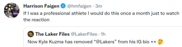 湖人跟队记者Harrison Faigen调侃库兹马的举动,他写道:“如果我是一名职业运动员,我会每个月进行一次这样的操作,然后看看大家的反应。”