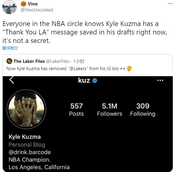湖人球迷Vino发推写道:现在NBA圈子里的每个人都知道,库兹马手机短信里保存一条“谢谢你,湖人”的消息,这不是什么秘密。
