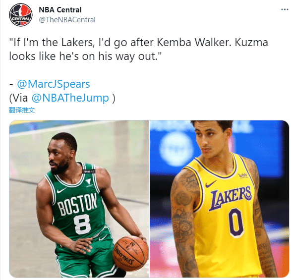 名记Marc Spears在节目中表示:如果我是湖人,我将会追求肯巴-沃克,看起来库兹马正在离开的路上;言外之意就是湖人该交易库兹马并引援沃克。