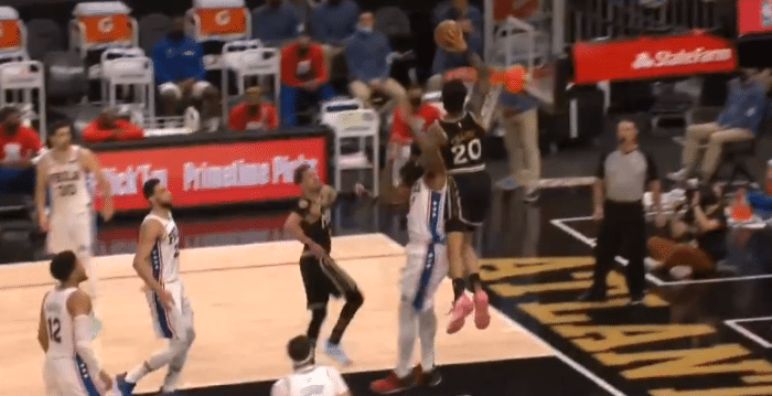 第三节4分多钟,特雷杨持球组织进攻,顺势向空中一抛,科林斯心领神会,高高跃起直接隔扣恩比德,空接平筐隔扣,然后和特雷杨一起庆祝,不过科林斯另外一只手搂住了恩比德脖子,恩比德面部被打了一下,有些痛苦,甚至坐在地板上缓了一会;回放之后,裁判仍旧吹罚恩比德防守犯规,科林斯残暴隔扣引热议。