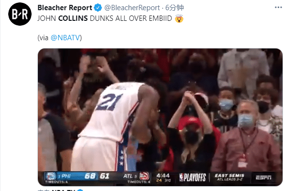 科林斯空接平筐隔扣恩比德瞬间冲上推特热搜,美媒纷纷转发这极其残暴的一幕,《露天看台》和NBA TV都发推写道科林斯在恩比德头上扣篮;科林斯残忍羞辱恩比德,这一球提前预定今日十佳扣篮之首,骑在大帝头上扣篮,老鹰悍将太疯狂了。