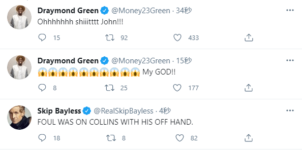 勇士球星德拉蒙德-格林第一时间发推:我的天呐!约翰-科林斯;名嘴贝勒斯发推质疑科林斯犯规:科林斯另一只手犯规了。