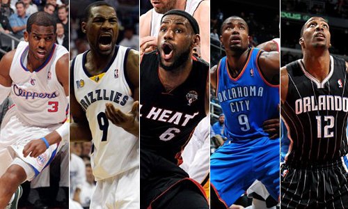 勒布朗-詹姆斯(热火、)、塞尔吉-伊巴卡(雷霆、)、克里斯-保罗(快船、)、托尼-阿伦(灰熊、)、德怀特-霍华德(魔术、)