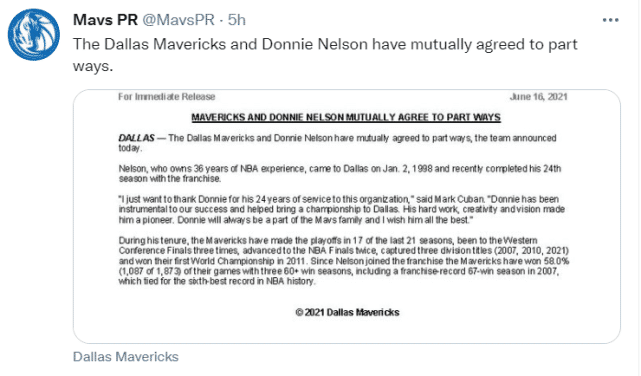 “我想感谢唐尼(小尼尔森)为这支球队服务了24年,”独行侠老板库班说道,“唐尼对我们的成功至关重要,并帮助球队获得了一座总冠军奖杯。他工作勤奋,富有创造力和远见,是一个先锋。唐尼将永远是独行侠大家庭的一员,我祝福他一切都好。”