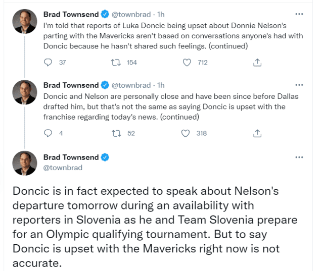 独行侠跟队记者Brad Townsend报道称,消息源告知他,东契奇对于小尼尔森的离开感到沮丧,因为两人私交很深,目前,东契奇已经返回斯洛文尼亚,备战奥运会资格赛。Brad Townsend强调,东契奇只是对小尼尔森离开感到沮丧,并不是对独行侠这支球队感到沮丧。