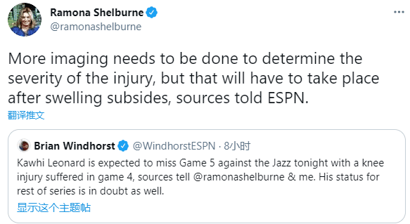来源:jrs直播网06-17 10:26jrs直播网讯 北京时间6月17日,快船领袖莱昂纳德惨遭十字韧带的伤病,目前他的膝盖还没消肿,从而无法接受进一步的检查来确定受伤的严重程度;季后赛关键时期,小卡遭遇重伤,暂时还没有具体回归时间表,名嘴直呼快船完了。