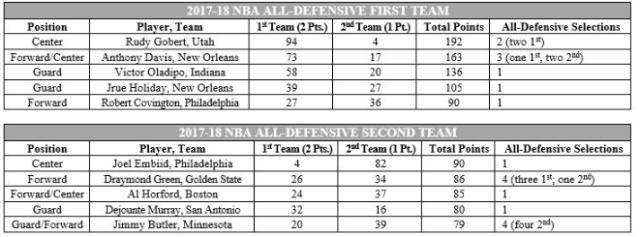 恩比德(76人、90)、德雷蒙德-格林(勇士、86)、霍福德(凯尔特人、85)、默里(马刺、80)、吉米-巴特勒(森林狼、79)