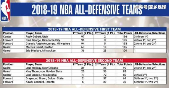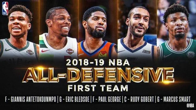 鲁迪-戈贝尔(爵士、196分);保罗-乔治(雷霆、195分);扬尼斯-安特托昆博(雄鹿、193分);马库斯-斯玛特(凯尔特人、145分);埃里克-布莱德索(雄鹿、100分);