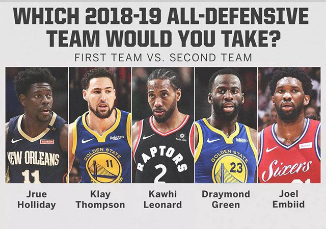 朱-霍勒迪(鹈鹕、90分);克莱-汤普森(勇士、82分);乔尔-恩比德(76人、80分);德拉蒙德-格林(勇士、61分);科怀-伦纳德(猛龙、39分);