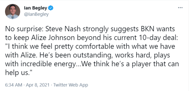 为了给球星更多的休息时间,篮网需要更多球员能挺身而出,近期状态不错的阿利兹-约翰逊有望继续留队。纳什很欣赏他,认为他工作努力,打球很有能量。“我们认为他是一个可以帮到我们的球员。”纳什表示。如果篮网和约翰逊签约至赛季结束,他们的引援工作就基本结束了。