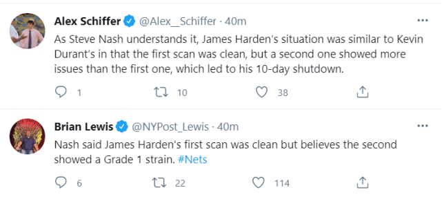 纳什表示,哈登的第一次核磁检查,返回的结果是没有问题的,但第二次核磁检查,发现哈登的腿筋一级拉伤。篮网记者Schiffer表示,哈登的情况和当时杜兰特类似,也是第一次检查没问题,第二次检查发现情况比第一次严重。这也导致哈登至少将缺席10天的比赛。