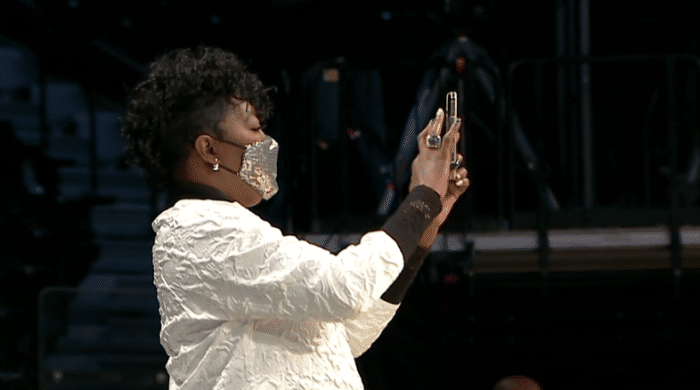 7分37秒的时候,杜兰特替补登场,KD的妈妈也在场边拿着手机,记录下这一幕,她的儿子终于重返赛场。